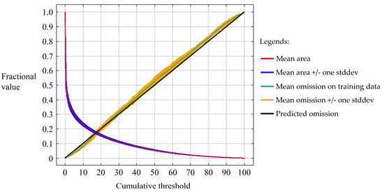 We evaluated the predictive accuracy of the MaxEnt models by evaluating the area under the receiver operating characteristic (ROC) curve (AUC) and the AUC value of the partial-area ROC (P-ROC AUC) [67,68]. The AUC values ranged from 0.5 to 1. An AUC in the range of 0.5 to 0.6 indicated a negligible predictive capability, 0.6 to 0.7 suggested limited predictive prowess, 0.7 to 0.8 implied a moderate predictive capacity, 0.8 to 0.9 indicated substantial predictive competence, and 0.9 to 1.0 signified a strong predictive capacity [67]. Regarding the P-ROC AUC, we applied a 5% error rate (E = 0.05) to calculate the AUC ratios, specifically AUC ratio = AUCE/AUC0.5, using Niche Analyst software v3.0 (available online: https://nichea.sourceforge.net/, accessed on 15 February 2022, free). Here, AUCE represents the area under the curve within the specified error rate (E = 0.05), while AUC0.5 denotes the area under the curve for a random prediction (AUC = 0.5). The AUC ratio quantifies the improvement of the model’s predictive performance over a random prediction, with values greater than 1.0 indicating a better performance than random. This approach allows us to evaluate the model’s accuracy in the context of partial-area ROC analysis [68].