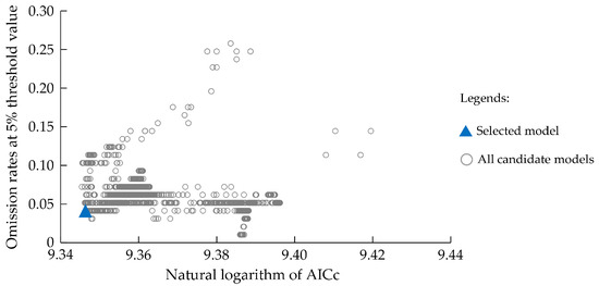 To assess model overfitting, we employed several criteria: the minimum training presence omission rate (ORmtp) and the 10th percentile training presence omission rates (OR10) [27]. The model’s predictive performance was considered excellent when both ORmtp approached 0 and OR10 neared 0.1 [66].