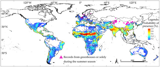 Records from greenhouse and summer-only presence expanded further to the north and east, with their northern and eastern boundaries extending approximately 14.12° and 2.26° beyond the species’ natural occurrence records, respectively (Figure 1). The highest elevation recorded increased by approximately 930 m (Figure 1).