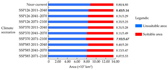 The MaxEnt model produced consensus maps depicting suitable and unsuitable areas for T. absoluta, as shown in Figure 6. We calculated the areas of climatic suitability and unsuitability for T. absoluta under near-current and future climate conditions (Figure 7). Under near-current climate conditions, the potential climatic suitability area for T. absoluta was 4.80 × 107 km2, accounting for 35.29% of the world’s land area, excluding Antarctica (Figure 6). Our predicted results indicate that a significant portion of the world remains suitable for T. absoluta.