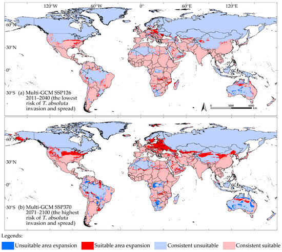 In comparison to the model outputs under near-current climate conditions, the multi-GCM predicted the lowest (a) and highest (b) probabilities of T. absoluta invasion and spread under future climate conditions.