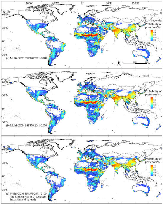 In the absence of complex terrain barriers, climate change-induced warming is expected to facilitate the continuous migration of species and entire biotic communities toward higher latitudes or altitudes [81]. These shifts are anticipated to occur more rapidly in high-latitude regions compared to those closer to the equator, due to the anticipated faster warming in these areas [85,86]. According to the multi-GCM predictions, under the highest risk scenario of T. absoluta invasion and spread (SSP370, assuming high greenhouse gas emissions), climatic suitability is projected to increase predominantly in areas at higher latitudes or altitudes. In contrast, under the lowest risk scenario (SSP126, assuming low greenhouse gas emissions), the increase in climatic suitability is less pronounced. This suggests that, as greenhouse gas emissions rise, T. absoluta is likely to invade more regions. In areas where farmers lack preventive measures, this could lead to more frequent biological invasions and associated economic losses.