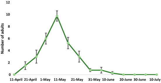 Mean number (± SE) of adult Polydrusus tibialis captured in traps in two peach orchards in the regional unit of Pella during the growing season of 2024.