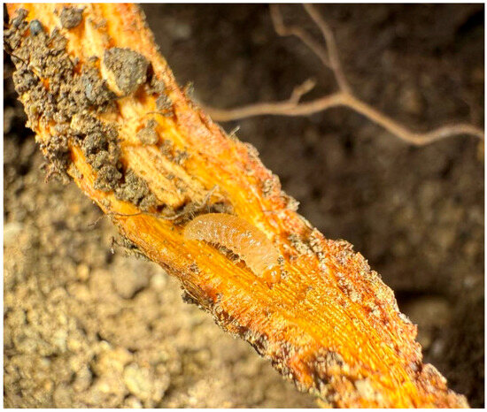 Larva of Polydrusus tibialis feeding on cambium/xylem tissues of a peach root.