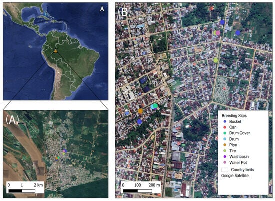 Sampling area satellite view indicating the positive breeding sites identified with Ae. aegypti. (A) View of Leticia, Colombia, and its national borders. (B) Location and type of positive artificial breeding sites (in circles) of Ae. aegypti were detected during an extreme dry season in November of 2023.