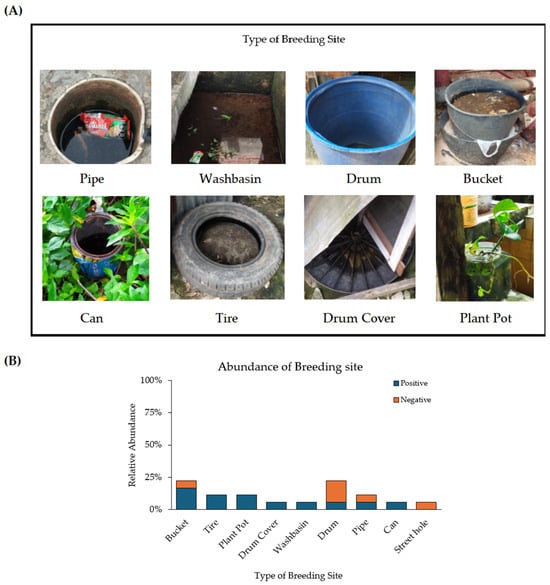 (A) Type of positive artificial breeding sites for Ae. aegypti found in Leticia, Amazonas. (B) Relative abundance of positive and negative breeding sites.