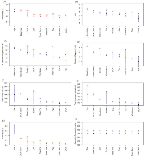 Physicochemical characteristics of Ae. aegypti artificial breeding sites grouped by Tukey’s statistics. (A) Temperature (p-value = 0.028); three groups (a, ab, and b) are shown that are significantly different. (B) pH (p-value = 0.17). (C) Dissolved oxygen percentage (p-value = 0.73). (D) Dissolved oxygen concentration (p-value = 0.49). (E) Electrical conductivity (p-value = 0.53). (F) Total dissolved solids (p-value = 0.51). (G) Salinity (p-value = 0.008); three groups (a, ab and b) are shown with statistically significant differences. (H) Barometric pressure (p-value = 0.056).