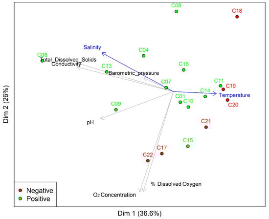 Bitplot representation of the PCA of the relationship between physicochemical variables and positive/negative categorization of Ae. aegypti breeding sites. Vector lines represent physicochemical parameters and the direction head of the vectors indicates an increase in magnitude. The points and codes refer to the positive (green color) and negative (red color) breeding sites.