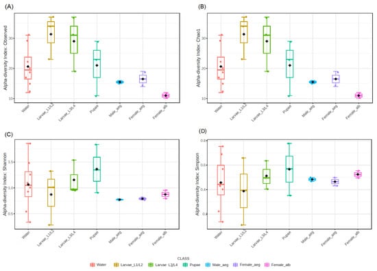 ASV richness and alpha diversity indices of water from the artificial breeding sites and Ae. aegypti and Ae. albopictus. (A) Observable richness (F-value = 2.02; p-value = 0.12), (B) Chao 1 index (F-value = 2.02; p-value = 0.12), (C) Shannon index (F-value = 1.01; p-value = 0.45), and (D) Simpson index (F-value = 0.53; p-value = 0.78). Water, water samples from artificial breeding sites; Larvae_L1/L2, samples of L1–L2 stage larvae; Larvae_L3/L4, samples of L3–L4 stage larvae; pupae, samples of pupae; Male_aeg, males of Ae. aegypti; Female_aeg, females of Ae. Aegypti; and Female_alb, females of Ae. albopictus. The black rhombus represented the mean value and the middle whiskers in the box were the median.