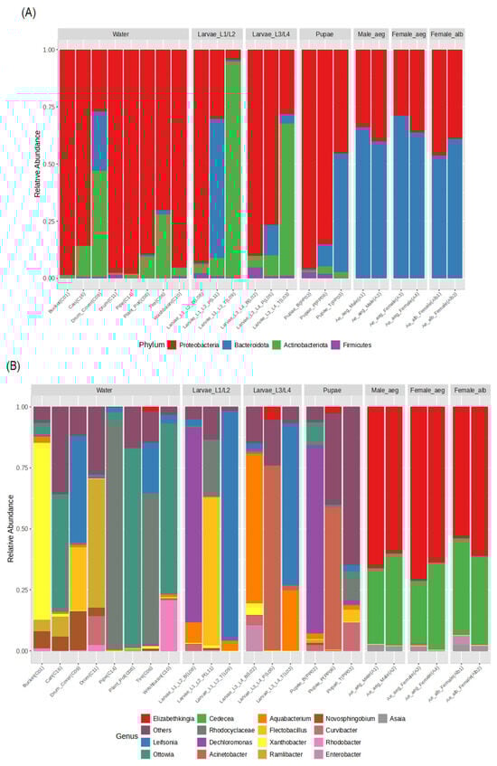 Relative abundance profiles of ASVs from water bodies of artificial breeding sites, larvae, pupae, and adults of Ae. aegypti and Ae. albopictus females. (A) Relative abundance at the phylum level. (B) Relative abundance of principal genera.