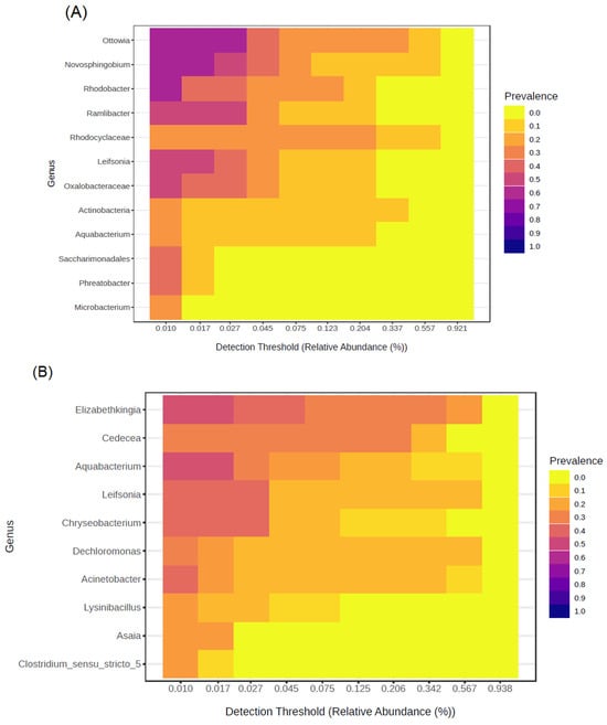The core community related to water bodies from artificial breeding sites differs between immature and adult Ae. aegypti. In water samples collected from these breeding sites, twelve bacterial genera were identified. The most prevalent were Ottowia, Rhodobacter, and Novosphingobium, which together accounted for 63% of the samples (Figure 7A). Regarding the immature and adult Ae. aegypti, eight bacterial genera were identified as being part of their core community. Notably, Elizabethkingia and Aquabacterium were the most prevalent, found in 46% of the samples (Figure 7B). Another important finding was that the genera Aquabacterium and Leifsonia both had a prevalence of 50% in the core community of the water bodies. In the case of immature and adult Ae. aegypti, Aquabacterium was present in 46% of the samples, while Leifsonia was found in 38% (Figure 7).