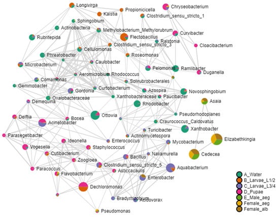 The interaction network established using the Pearson coefficient revealed an organization of six distinct groups of bacterial communities, categorized by their developmental stage or origin (Figure 8). Ae. aegypti breeding site water samples, located in the center of the network, showed correlations with all of the immature stages, highlighting the genera related to L1–L2 larvae (Figure 8). Nonetheless, the pupae presented two groups, one related to the water samples and the other integrating correlations between water samples and L3–L4 larvae. Additionally, a separate group was observed consisting of bacterial genera Asaia, Cedecea, and Elizabethkingia, mainly related to the adult stages.