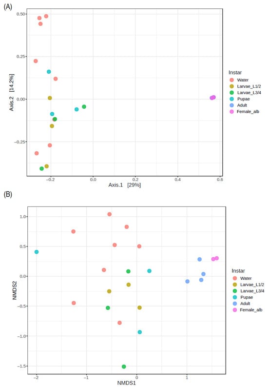 Beta diversity of bacterial communities in artificial breeding site water samples, larvae, pupae, and adults of Ae. aegypti and females of Ae. albopictus. (A) Principal coordinates analysis (PCoA) was generated with the Bray–Curtis index (PERMANOVA F-value = 2.60; p-value = 0.001; R2 = 0.43). (B) Nonparametric multidimensional scaling (NMDS) analysis: significant differences were found between adults of Ae. aegypti and water body samples from breeding sites, larvae, and pupae forming two different groups (PERMANOVA F-value = 2.60; p-value = 0.001; R2 = 0.43 and a stress level of 0.19). Water: water breeding sites samples; Larvae_L1/2: samples of L1–L2 stage larvae; Larvae L3/4: samples of L3–L4 stage larvae; pupae: samples of pupae; Male_aeg, males of Ae. aegypti; Female_aeg, females of Ae. aegypti; and Female_alb, females of Ae. albopictus.