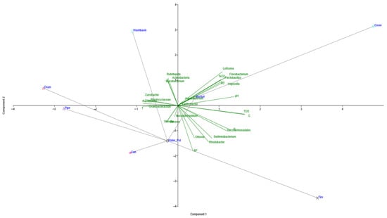 Correlation of the 20 most abundant bacterial genera and the influence of the physicochemical parameters associated with each type of breeding site based on the Bray–Curtis index.