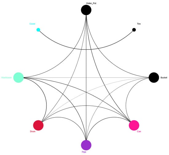 Finally, multivariate analysis assessing the interaction between different artificial breeding sites for Ae. aegypti, physicochemical variables, and the most abundant bacterial genera in the water bodies showed an influence of bacterial communities on the different breeding site types. This analysis generated three distinct groups: The first group comprised washbasins, drums, and pipes (Figure 10 and Figure 11), which were associated with high temperature and low salinity and showed a high abundance of Rhodocyclaceae, Ramilibacter, Actinobacteria, and Mycobacterium (Figure 10). The second group included buckets, plant pots, and cans (Figure 10) and was related to genera such as Xanthobacter, Aquabacterium, Novosphingobium, and Ottowia (Figure 10). The third group was associated with the tire and drum cover breeding sites (Figure 10 and Figure 11), which exhibited high levels of total dissolved solids, conductivity, and salinity, and included genera such as Flectobacillus, Leifsonia, Novosphingobium, Ottowia, and Rhodobacter (Figure 10). All of these findings are summarized in the interaction network of Ae. aegypti artificial breeding sites (see Figure 11). This network illustrates that the tire and drum cover breeding sites are directly related and distinct from other interactions, while the other container types show multiple correlations among themselves. Notably, the plant pot breeding site demonstrates strong correlations (indicated in black) with all other types of breeding sites.