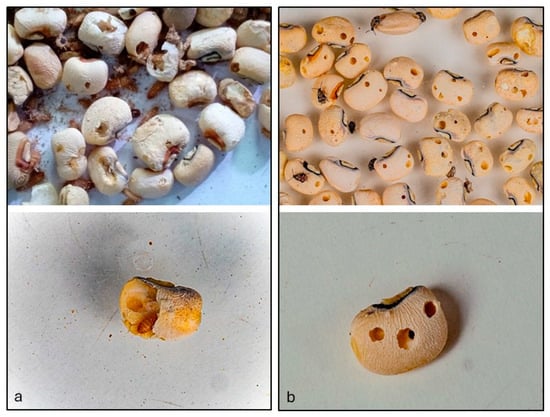 - Tripathi, K.; Prasad, T.V.; Bhardwaj, R.; Jha, S.K.; Semwal, D.P.; Gore, P.G.; Sharma, P.K.; Bhalla, S. Evaluation of Diverse Germplasm of Cowpea [Vigna unguiculata (L.) Walp.] against Bruchid [Callosobruchus maculatus (Fab.)] and Correlation with Physical and Biochemical Parameters of Seed. Plant Genet. Resour. Charact. Util. 2020, 18, 120–129. [Google Scholar] [CrossRef]