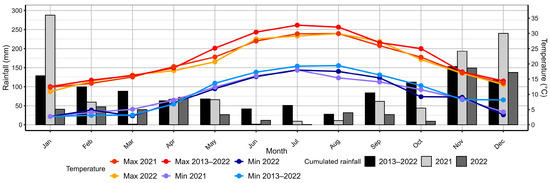 Monthly cumulated rainfall and average minimum and maximum monthly temperature (maximum and minimum) Uliveto Terme weather station, from January 2013 to December 2022.