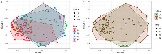 NMDS plots showing the differences in flower community composition across sampling times (a) and habitats (b). The analysis was based on the Bray–Curtis dissimilarity matrix, calculated using the square-root transformed species abundance data. NMDS stress value = 0.221. Panel (a): shapes represent the different habitats: herbaceous linear (HL, circles), olive grove (OL, triangles), and woody area (WA, squares). Colors represent the four sampling times: May (T1: red), June (T2: blue), July (T3: green), and September (T4: purple). Convex hulls illustrate the grouping of communities within each time. Panel (b): shapes represent the different sampling times: T1 (circles), T2 (triangles), T3 (squares), and T4 (crosses). Colors indicate the two habitats: olive grove (OL, green) and woody area (WA, brown). Herbaceous linear (HL) is not shown to ease interpretation. Convex hulls illustrate the separation of communities within each habitat.