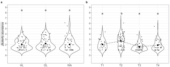 Butterfly abundance (square root transformed) in both years (2021 and 2022 aggregated) across the three habitats: (a) (HL: herbaceous linear, OL: olive grove, WA: woody area); and four sampling times: (b) (T1: May, T2: June, T3: July, T4: September). Significant differences between sampling times are indicated by different letters (p < 0.05 with Hochberg’s adjustment). The black circles represent the mean butterfly abundance.