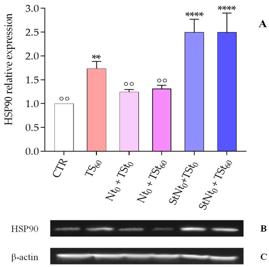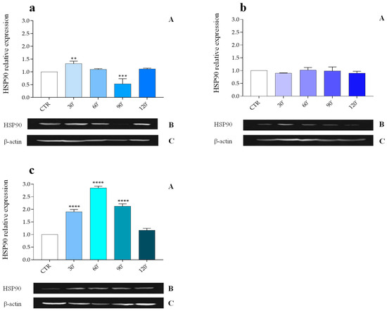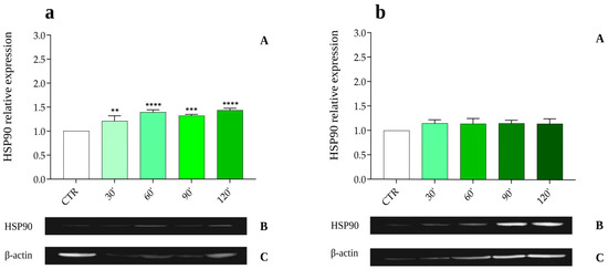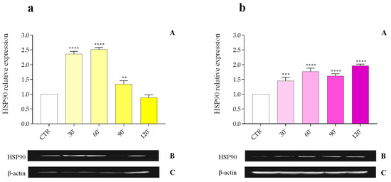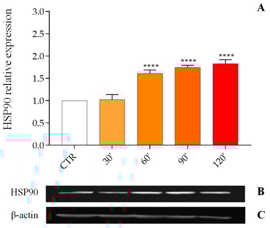 The expression levels of HSP90 were analyzed after stress at 40 °C (Figure 1, Panel A); thermal treatment resulted in an increase in the protein relative expression (PRE) of the target protein from 1.61 ± 0.079 at 60 min to 1.83 ± 0.093 at 120 min.