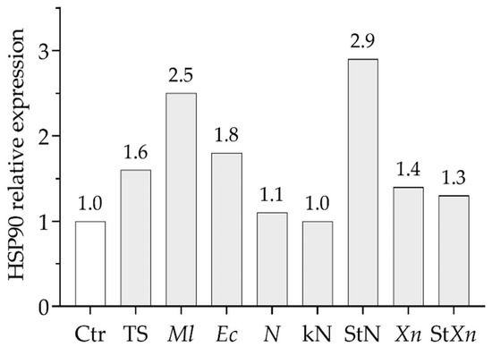 Comparison of HSP90 relative expression in the fat body at 60 min after treatments. Ctr: control; TS: thermal shock; Ml: M. luteus; Ec: E. coli; N: S. carpocapsae; KN: cold-killed S. carpocapsae; StN: surface-treated S. carpocapsae; Xn: X. nematophila; StXn: surface-treated X. nematophila.
