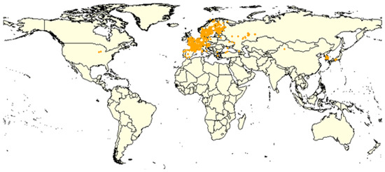 Geographic distribution of Crustulina guttata. Orange points represent the recorded locations of C. guttata, based on the GBIF database (accessed on 7 August 2023), occurrence records from a national survey by the National Institute of Forest Science (NIFOS), and additional data from other studies (see Table S1).