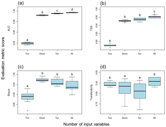 Distribution of (a) AUC, (b) TSS, (c) BI, and (d) transferability evaluation metrics for climate envelope model (CEM) using different specified combinations of bioclimatic variables: two-factor—bio1 and bio12; seven-factor—bio1, bio4, bio10, bio11, bio12, bio16, and bio17; ten-factor—bio3, bio4, bio5, bio6, bio9, bio11, bio12, bio15, bio16, and bio17. The selected input variables are detailed in Table 1. Different letters on the bars indicate significant differences between values (p < 0.05), as assessed by the Kruskal–Wallis test.