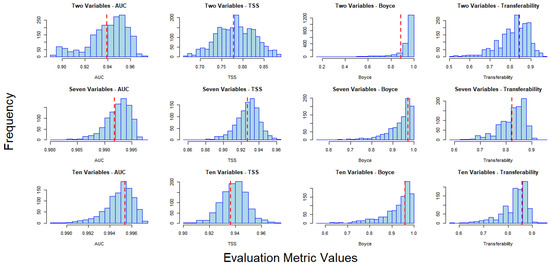 When the specified models were compared to the randomized models with the same number of variables, no statistically significant differences in performance were observed (p > 0.05). Across all metrics, the specified two-factor, seven-factor, and ten-factor models did not outperform the upper range of distributions for the corresponding randomized models (Figure 3). The average performance metrics for the randomized models were as follows: The mean AUC values were 0.94 for the two-factor model, 0.99 for the seven-factor model, and 0.99 for the ten-factor model. Similarly, the TSS values averaged 0.78, 0.93, and 0.94 for the two-factor, seven-factor, and ten-factor models, respectively. For the BI, the averages were 0.93, 0.93, and 0.92, while Transferability values were 0.82, 0.83, and 0.83 for the same models. The randomized two-factor model exhibited lower AUC and TSS scores compared to the other models, but it showed minimal differences in the BI and Transferability. This pattern was also observed in the specified two-factor model.