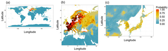The predicted occurrence probability of Crustulina guttata based on the Random Forest model using all 19 bioclimatic variables. Predictions are displayed for (a) the global scale, (b) Europe, and (c) East Asia. Known presence points of C. guttata are indicated by cross marks (+).