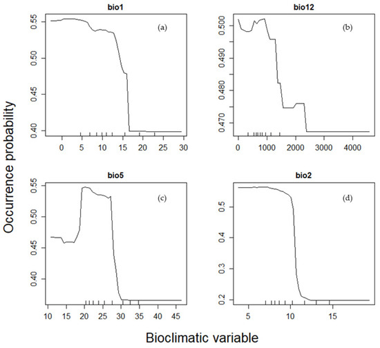 Partial dependence plots for four key bioclimatic variables from the full model using all 19 bioclimatic variables. The plots include two fundamental variables, mean annual temperature ((a): bio1) and annual precipitation ((b): bio12), as well as the two variables with the highest importance scores, maximum temperature of the warmest month ((c): bio5) and mean diurnal temperature range ((d): bio2).