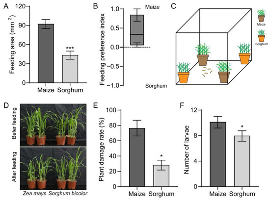 Using a two-choice test, we found that FAW larvae preferred maize over sorghum (Figure 1A). The FAW larvae displayed a stronger response to maize with a feeding preference index (PI) value of 0.4 (Figure 1B). We tested the preferences of the larvae towards the maize and sorghum plants (Figure 1C). Almost all maize plants were fed on by the FAW larvae, while the sorghum plants were fed on sparingly (Figure 1D). In contrast to maize, which had a 76.7% damage rate, the sorghum plants only had 28.6% damage (Figure 1E). The number of larvae collected from the sorghum plants was also lower than that collected from the maize (Figure 1F).