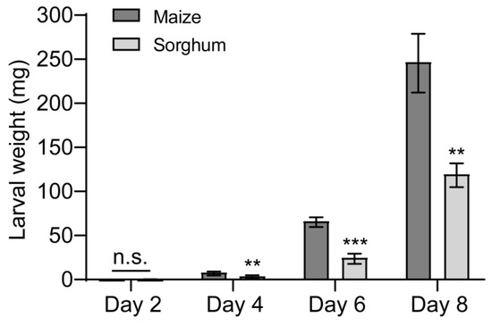 Finally, we evaluated the effect of maize and sorghum on the growth and development of FAW larvae using a no-choice feeding assay. The newly hatched larvae were fed on fresh maize and sorghum leaves in plastic culture tubes (2.4 cm diameter × 9.5 cm height) for eight days. Larvae fed on maize leaves were used as the control group, and larvae fed on sorghum leaves as the treatment group. Each leaf was changed every day and each larva was weighed every two days. The changes in larval weight were used to evaluate the growth rate of the larvae. The control and treatment experiments were repeated five times, and five larvae were used in each replicate.