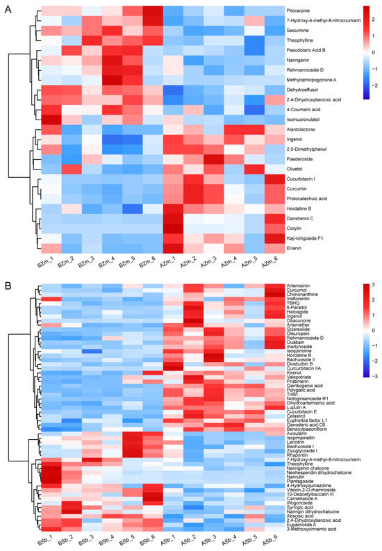 Phenols mainly include simple phenols and flavonoid compounds, and alkaloids are representative of secondary nitrogen-containing compounds [5]. Therefore, we went on to describe these differential compounds as terpenes, simple phenols, flavonoids, and alkaloids. In the BZm vs. AZm group, all DSMs included nine terpenes, eight simple phenols, four flavonoids, and four alkaloids, and the DSMs present in the BSb vs. ASb group were composed of twenty-eight terpenes, ten simple phenols, fourteen flavonoids, and five alkaloids (Table 1). We then further subdivided these compounds according to the classification characteristics of each class. The detailed classification of these compounds is shown in Table S1.
