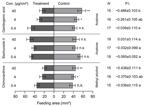Figure 5. Feeding responses of Spodoptera frugiperda larvae to three secondary compounds. The feeding preference of 5th-instar larvae of S. frugiperda to gambogenic acid, baohuoside II, and chimonanthine ranged from 0.4 to 40 μg/cm2. P.I., preference index. Data are presented as mean ± SEM. * p < 0.05, ** p < 0.01. Different letters labeled indicate significant differences and n.s. indicates no significant difference (p > 0.05).
