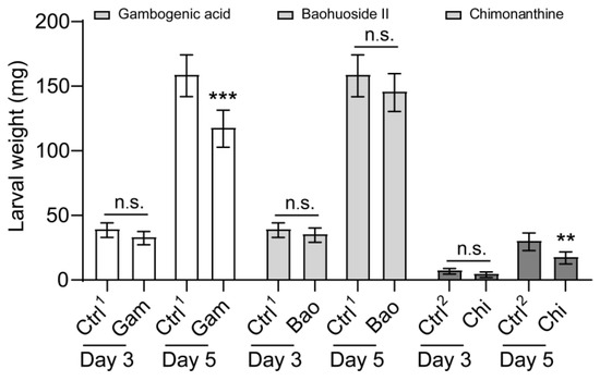 Figure 6. Effect of three secondary compounds on the larval growth rate of Spodoptera frugiperda. The growth rate of 2nd-instar S. frugiperda larvae to gambogenic acid, baohuoside II, and chimonanthine on day 3 and day 5. Gam, gambogenic acid; Bao, baohuoside II; Chi, chimonanthine. Ctrl1, acetone; Ctrl2, methyl alcohol. Data are presented as mean ± SEM. The nonparametric test (Mann–Whitney U test) was used. ** p < 0.01, *** p < 0.001; n.s. indicates no significant difference between control and treatment (p > 0.05). The colors white, grey, and black represent gambogenic acid, baohuoside II, and chimonanthine, respectively.