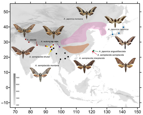 Distribution of species of the Ambulyx placida-group: A. japonica japonica (blue dots); A. japonica koreana (pink patch); A. japonica angustifasciata (green dots); A. placida (ochre squares); A. semiplacida semiplacida (red dots); A. semiplacida montana (black dots); A. semiplacida interplacida (orange patch); A. semiplacida bhutana (yellow dots); and A. wukong sp. nov. (purple squares).