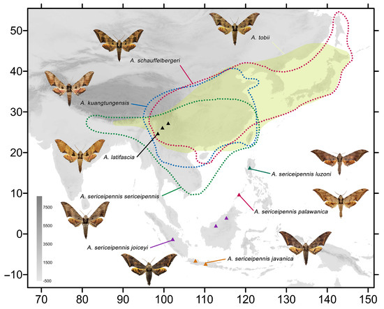 Distribution of species of the Ambulyx schauffelbergeri- and kuangtungensis-groups included in this study: A. latifascia (black triangles); A. schauffelbergeri (red dotted line); A. sericeipennis sericeipennis (green dotted line); A. s. joiceyi (purple triangles); A. s. javanica (orange triangles); A. s. luzoni (green triangles); A. s. palawanica (red triangles); and A. tobii (yellow patch).