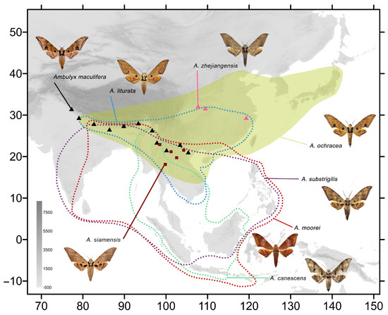 Distribution of the remaining species of Ambulyx from China: A. substrigilis (purple dotted line); A. siamensis (ochre squares); A. liturata (blue dotted line); A. moorei (red dotted line); A. canescens (green dotted line); A. ochracea (yellow patch); A. maculifera (black triangles); and A. zhejiangensis (pink triangles).