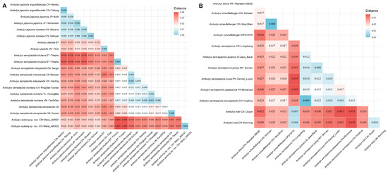 Kimura two-parameter (K2P) distances (in percentages) between taxa of the placida-group (A) and schauffelbergeri-group (B) calculated from DNA barcode sequences (cox1), with species identified as in the ggtree in Figure 4.