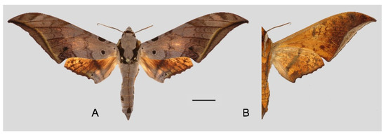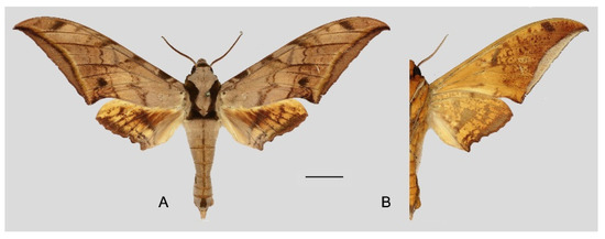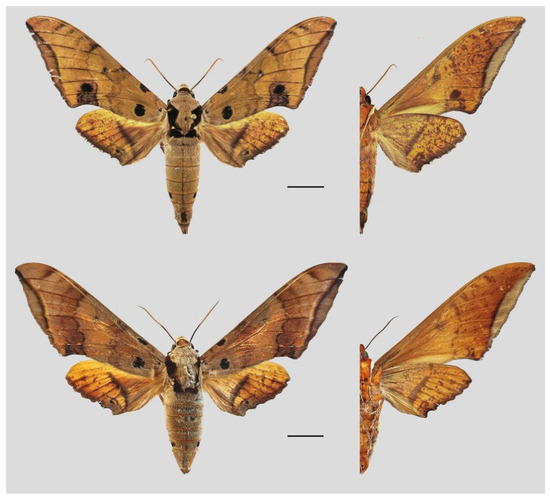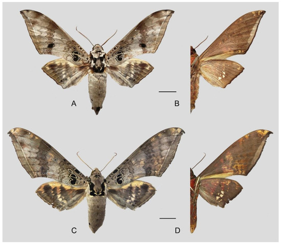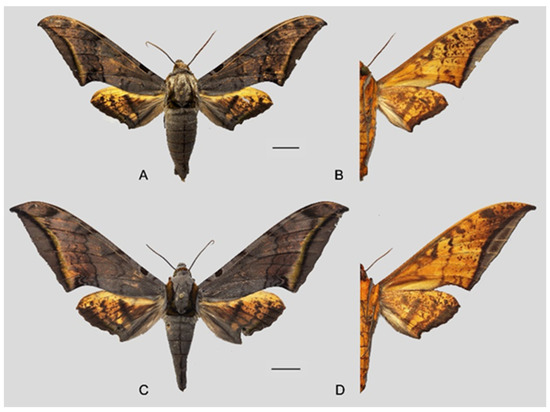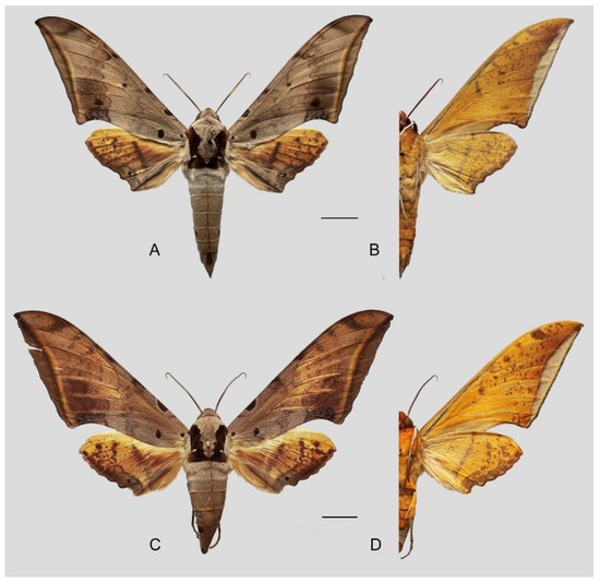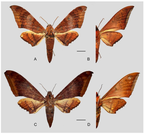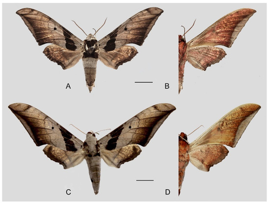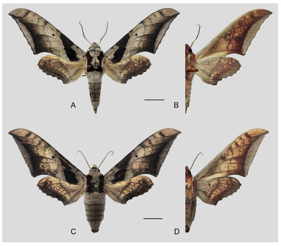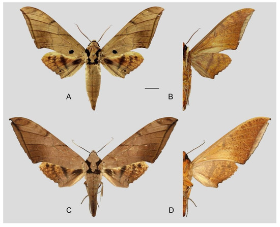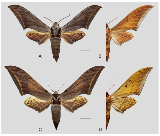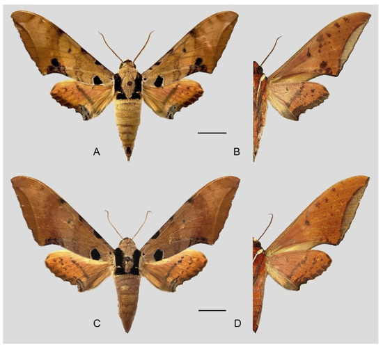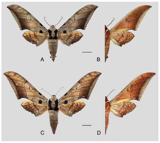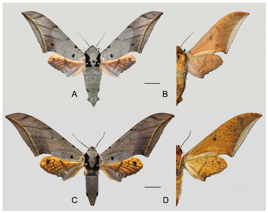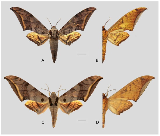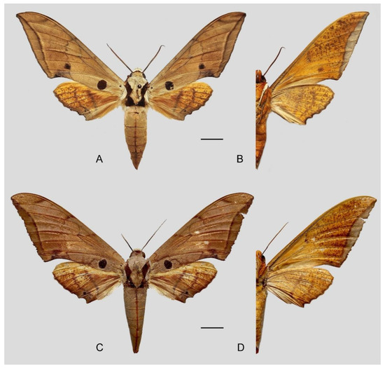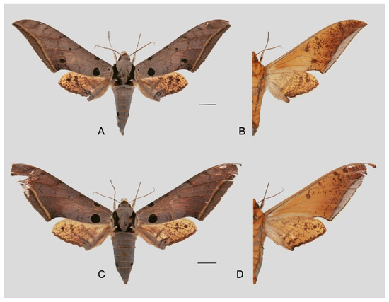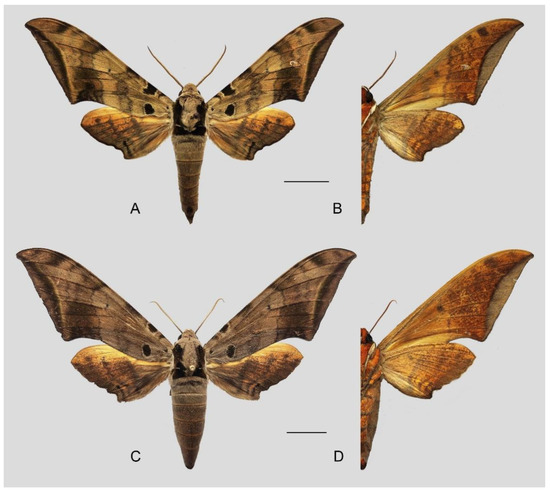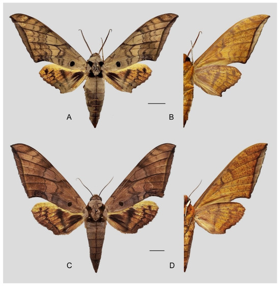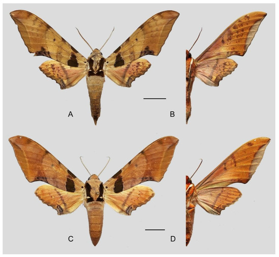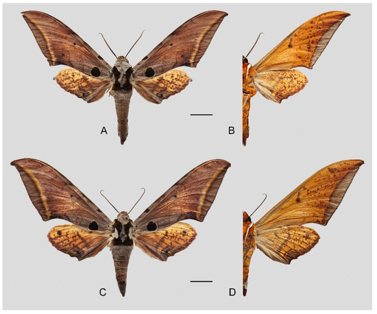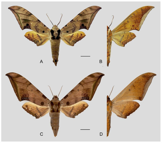 Ambulyx japonica koreana. (A,B) Male, Wuxi County, Chongqing, China; (C,D) female, Mentougou, Beijing, China. Scale bar = 10 mm.