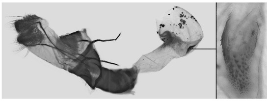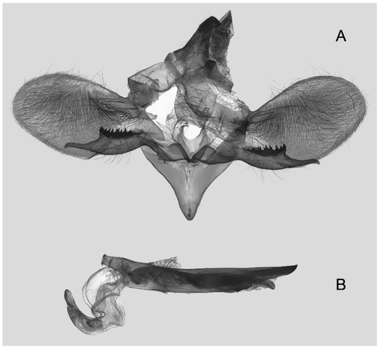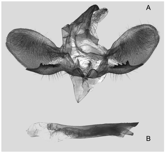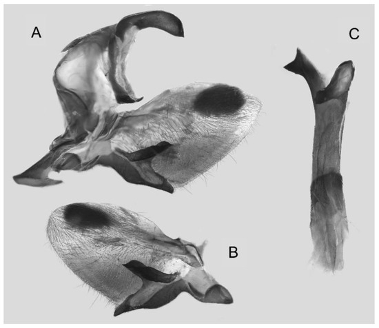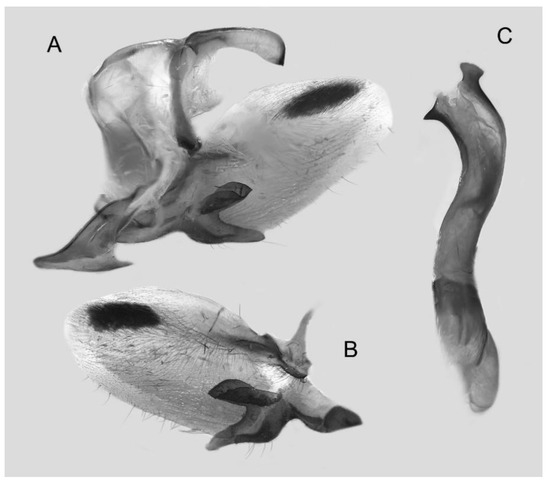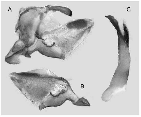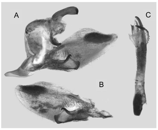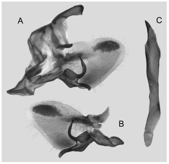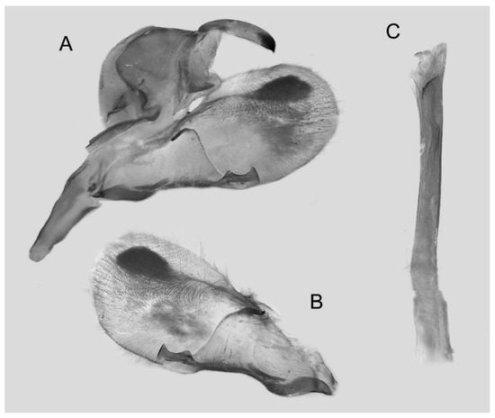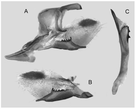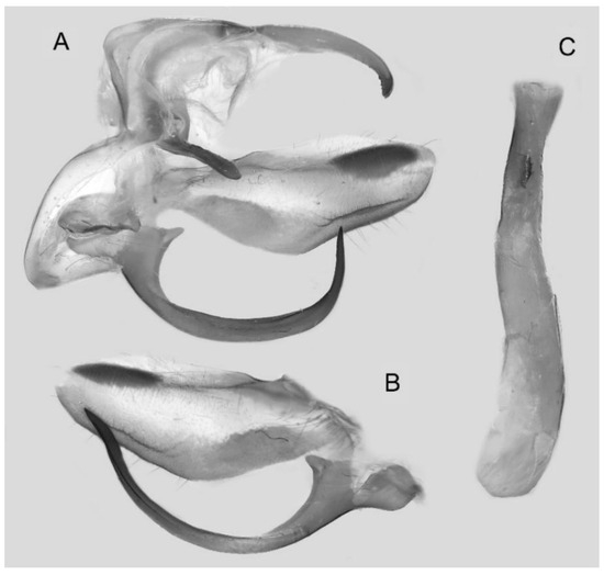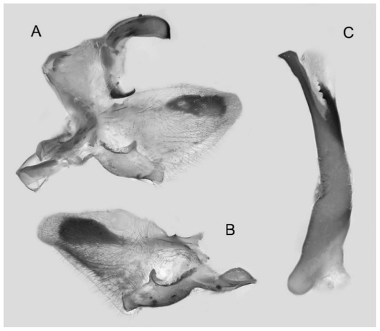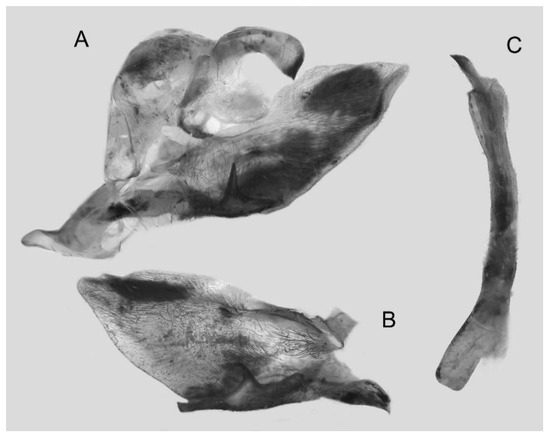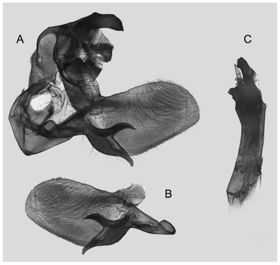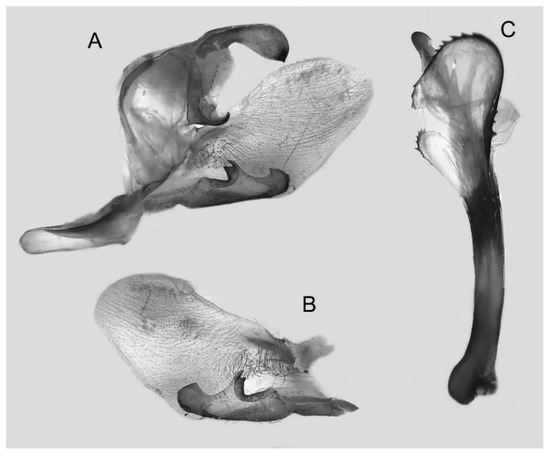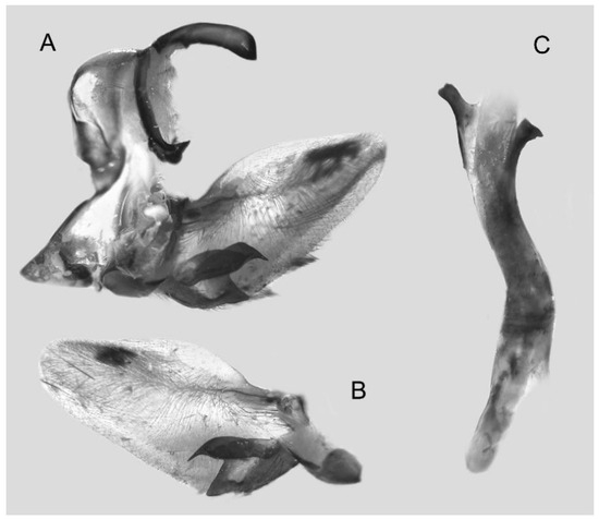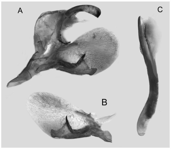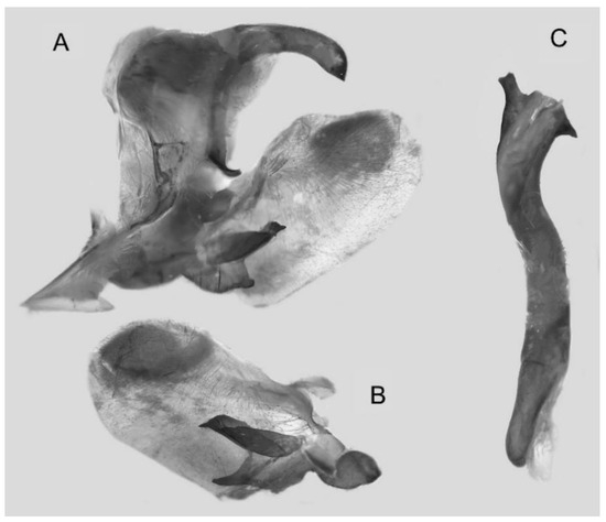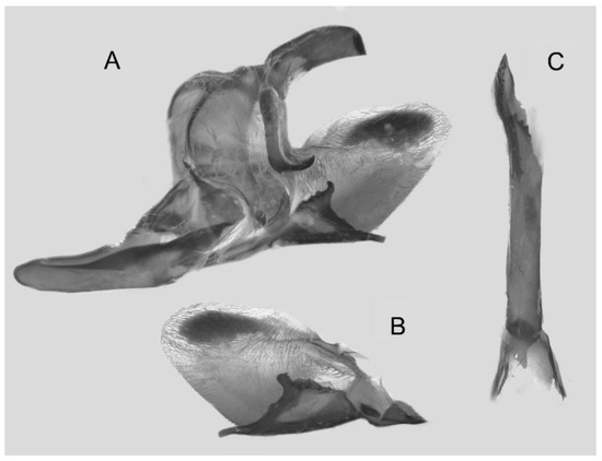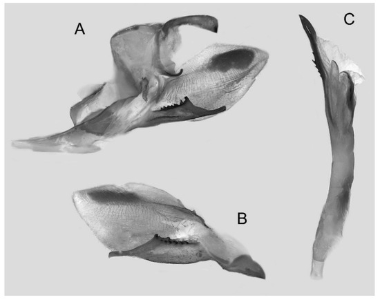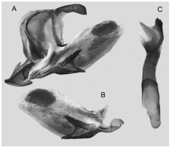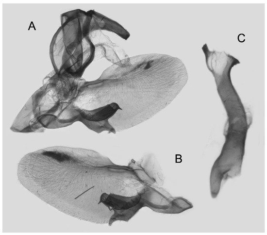 Male genitalia of Ambulyx japonica japonica, Namezawa Spa, Gumma, Japan. (A) Lateral view; (B) left valve; (C) phallus. © The Trustees of the Natural History Museum, London, UK (downloaded from Kitching, I.J. Sphingidae Taxonomic Inventory. http://sphingidae.myspecies.info/, accessed on 20 April 2024.