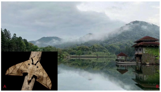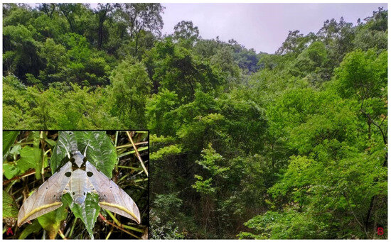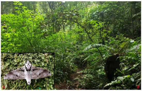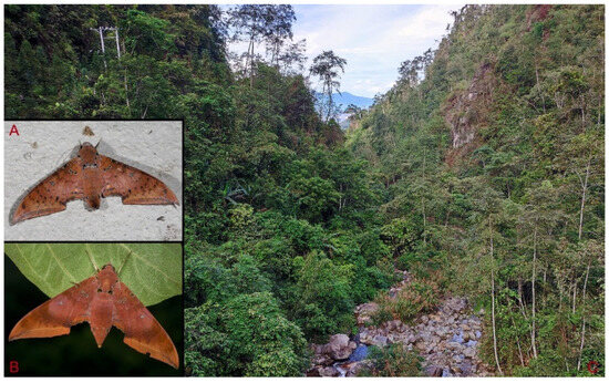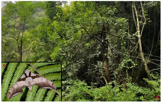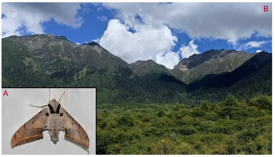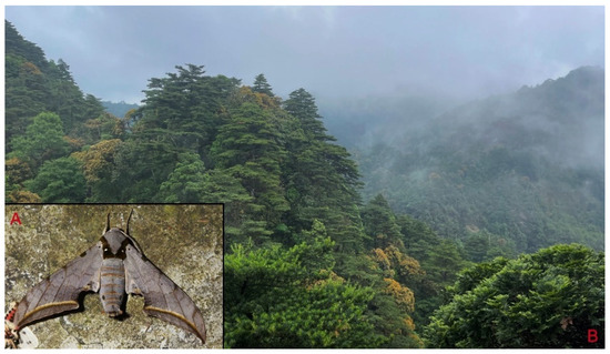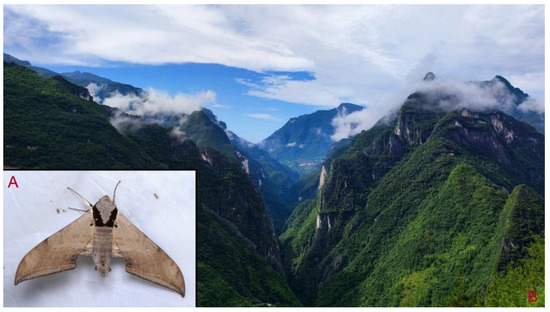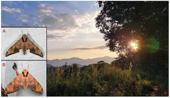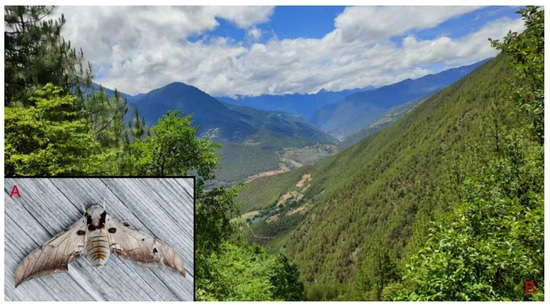 Habitat and living adult of Ambulyx canescens. (A) Male; (B) Yingjiang County, Yunnan, China.
