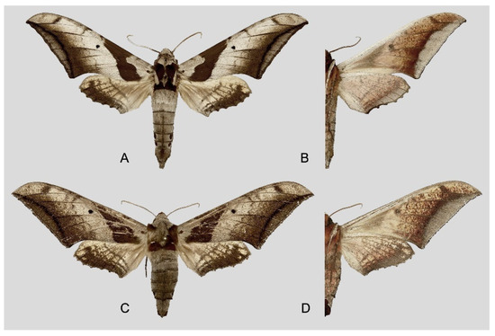 Ambulyx japonica japonica. (A,B) Male, Mikoboyama, Gumma, Japan; (C,D) female, Iruma, Saitama, Japan. © The Trustees of the Natural History Museum, London, UK (downloaded from Kitching, I.J. Sphingidae Taxonomic Inventory. http://sphingidae.myspecies.info, accessed on 20 April 2024.