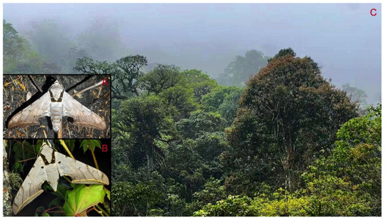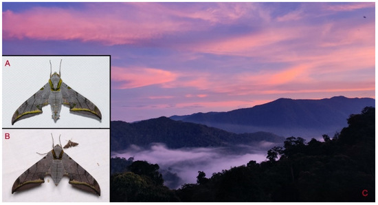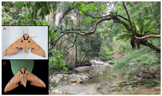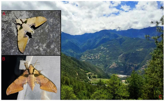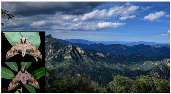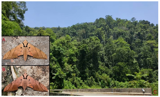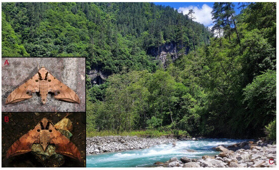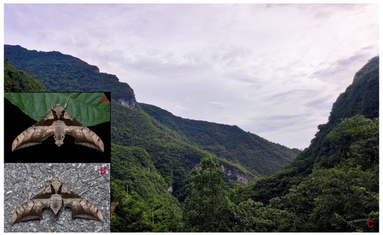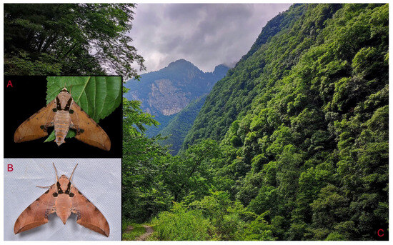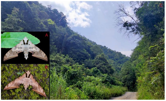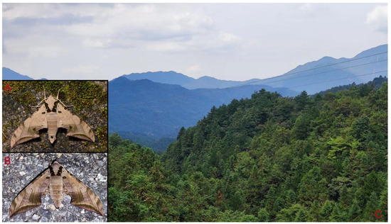 Habitat and living adults of Ambulyx japonica koreana. (A) Male; (B) female; (C) Wuxi County, Chongqing, China.
