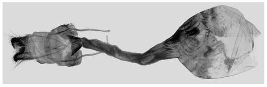 Female genitalia (Figure 8): Anal papillae rounded. Lamella antevaginalis sclerotized, with two lateral annular structures that fuse to the bases of the anterior apophyses; lamella postvaginalis thicker and broad; antrum short and narrow. Ductus bursae tubular, membranous and broad. Corpus bursae membranous and oval, signum circular with tiny spinules around the edge.