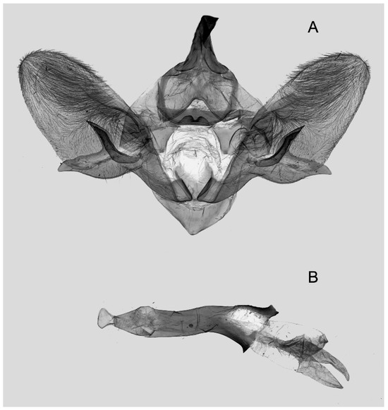 Diagnosis: Male (Figure 6A,B): Head—grey; thorax—grey with wide black spots and a “V” shape black patch dorsally; abdomen—upperside greyish with a broken black line dorsally, tergum A8 with a dark patch dorsally and a tiny black spot on each side of segment 6 laterally. Forewing long, triangular with sharp apex, outer margin smooth, distal portion of inner margin slightly concave; upperside ground colour grey with scattered with pale brown scales, basal to medial area with three grey-brown zigzag lines, two separate and three connected to black circular subbasal spots edged in yellowish, medial area to submarginal area with a dark grey zigzag patch, a grey-black patch near the apex, subterminal line greyish-white, straight, meeting the inner margin just basad of the tornus, marginal area greyish-brown; underside—ground colour brown, with yellow spots dotted near apex and tornus, marginal area greyish. Hindwing— upperside dark greyish with two brown zigzag lines, a yellow broken patch in medial area and a thin black dotted line in submarginal area; underside—ground colour brown, a yellowish-white broken patch in medial area, with yellow spots near the apex.