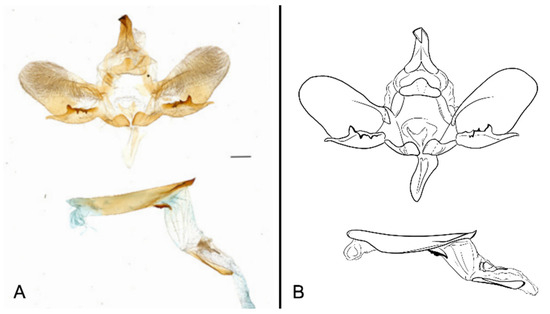Habitus images were taken using a Canon 7D camera in conjunction with a Canon MP-E 65 mm f/2.8 1–5X Macro Lens, and a Canon MT-24EX Macro Twin Lite Flash as a light source. Images of the genitalia were taken using a Canon G9 camera mounted on an Olympus CX31 microscope under reflection or transmission lighting. Zerene Stacker (version 1.04) was used for image stacking. All images were further adjusted and annotated using Adobe Photoshop CS6. The dissected genital structures were stored in pure glycerol in plastic centrifuge tubes labelled with detailed information on the specimens.