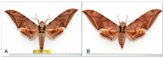 For each individual used for molecular analysis, two legs from the same side were taken for DNA extraction before the specimens were rehydrated for spreading. Additional sequences were downloaded from the Barcode of Life Database v.4 (BOLD) (http://www.boldsystems.org (accessed on 13 December 2024)) to provide as complete as possible species coverage for phylogenetic analysis. Collecting data, BOLD sample IDs, and GenBank accession numbers are provided in Table S1, list of the examined Ambulyx specimens in this study are shown in Appendix A.