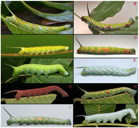 - Eitschberger, U.; Ihle, T. Raupen von Schwärmern Aus Laos Und Thailand–1. Beitrag (Lepidoptera, Sphingidae). Neue Entomol. Nachrichten 2010, 64, 101–114. [Google Scholar]