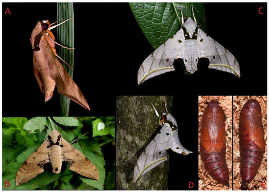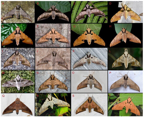 - Jiang, Z.-H.; Huang, C.-L. Hawkmoths of China; Haixia Art and Literature Publishing House: Fuzhou, China, 2023. [Google Scholar]